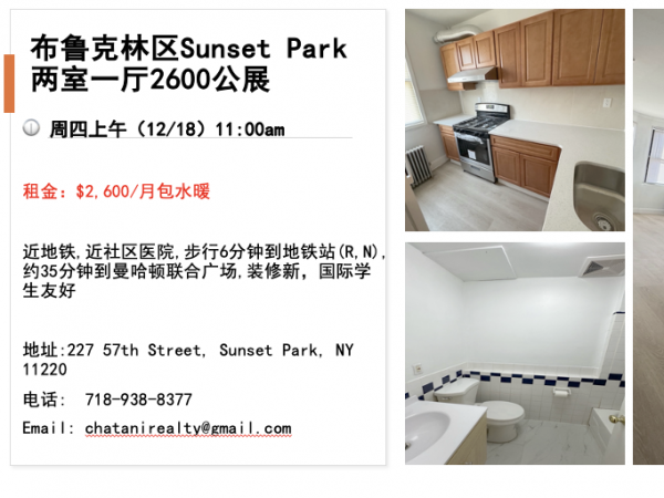 纽约布鲁克林区Sunset Park 两室一厅2600公展