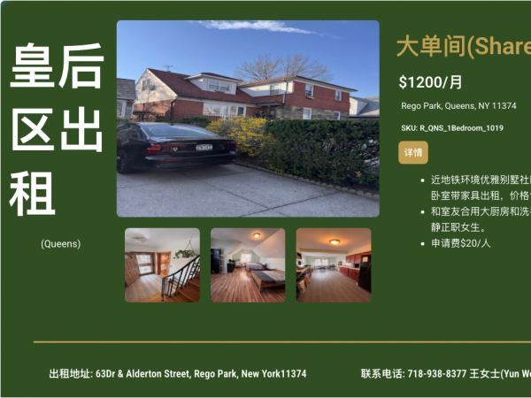皇后区Rego-Park_优雅别墅社区大单间出租1200