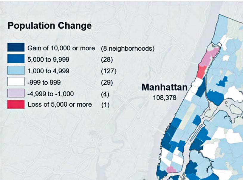 在曼哈頓,亞裔人口增長了23.6%,多個非傳統亞裔聚集區亞裔人口增加,其中地獄廚房亞裔人口增幅最大,達74%,雀兒喜-哈德遜廣場亞裔人口增幅達66%,但傳統亞裔聚集區的曼哈頓下城的亞裔人口則明顯減少,蘇豪區-小意大利-哈德遜廣場亞裔人口下降了17%、華埠-兩橋地區下降了14%,下東城亞裔人口下降了6%。
