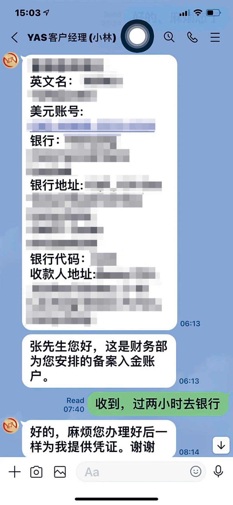 黃太太說,她經歷的騙局和張勝利的情況幾乎一模一樣,對方也是兩人團夥,除了打前陣的「陳志強」,還有一個「財務部江經理」幫助她開設賬戶,連對方要求她匯款的銀行賬戶也與張勝利的一樣,都是香港的南洋銀行。只不過這次對方用了一家香港真是存在的大型投資公司作為掩護,稱他是在該公司工作,甚至提供了該公司高管的名字。