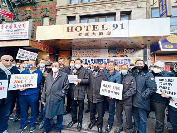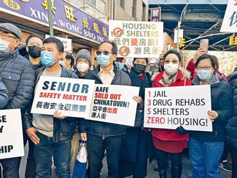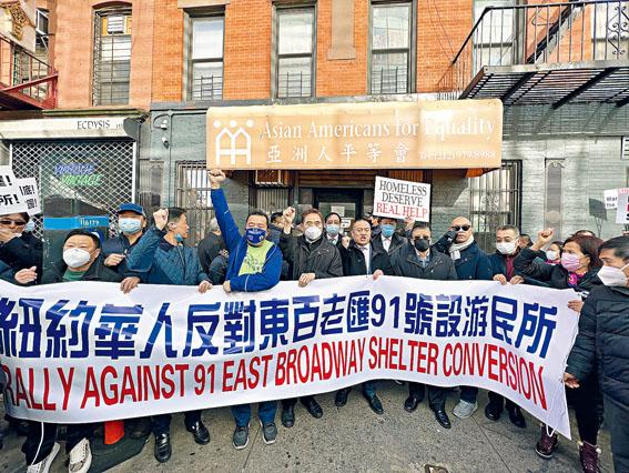 自從紐約市遊民局計劃將華埠東百老匯91號改建遊民收容所一事曝光後,在華埠社區激起千層浪。福建同鄉會、福建公所、長樂公會及福建會館四大閩籍僑團昨(1日)聯合多個僑團和社區代表在內的近三百人,在東百老匯91號舉行示威,抗議白思豪政府對華埠及華人社區的歧視性政策,要求市府公開決策過程,並呼籲華人社區集中資源和選票,團結一心,共同抗爭。