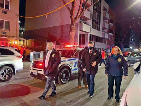 法拉盛10日晚發生槍殺案,一名華裔男子遭槍擊身亡,警方封鎖現場進行調查。(記者鄭怡嫣╱攝影命案現場附近的華人商家目擊者表示,傍晚約5時聽到槍響,見到一名華裔中年男子倒在街邊一動不動,據他的印象,該男子身著「薄衣與牛仔褲」,並未穿著外套。