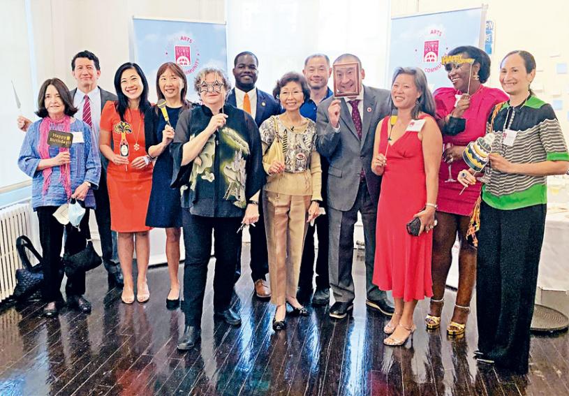 法拉盛市政廳執行和藝術總監Ellen Kodadek,法拉盛文藝中心的曾翁若梅,黃百齡等與紐約州參議員劉醇逸,法拉盛市議員黃敏儀,以及來自台灣的藝術家林世寶等逾百人共同舉杯慶祝法拉盛市政廳160周年。