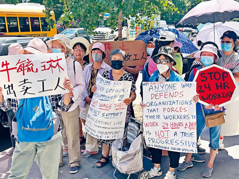 約60多名護理及前彩福樓欠薪工人及其他族裔支持者,3日日冒著酷暑在州議員牛毓琳辦公室前舉行示威,指責牛毓琳支持「血汗工廠老闆」,並且謊言不斷欠缺誠信,呼籲選民在8月23日的國會議員初選中不要把票投給牛毓琳。但牛毓琳堅稱,她從政以來一直為工人而戰。