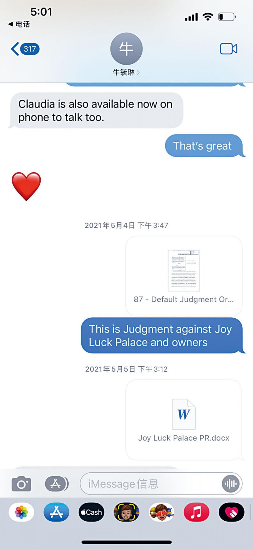 日前示威中,牛毓琳向記者表示,並不知道莫志聯被捲入彩福樓的糾紛中,昨日示威者曹錦明拿著手機對話短訊向記者展示,去年4月27日牛毓琳與4位工人在視頻會議談及此事,5月4日把彩福樓欠薪法庭判決書傳給她,5月5日把彩福樓欠薪新聞稿傳給她,5月6日通知她欠薪工人在彩福樓前示威。5月23日牛毓琳在慶祝亞太傳統月向莫志聯頒發了「社區英雄獎」。這些短訊都充份顯示了牛毓琳在說謊。
