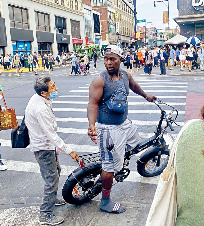 在4日下午2點左右,一名非裔男子騎著一輛電動車在緬街夾羅斯福大道時,被一名華裔大爺攔下。該非裔男子大喊:「我花了260元買下這輛車,這是我的車!」而這名大爺也稱這是自己的車,他拼命拽住電動車不讓非裔男子離開。雙方在路邊爭執不下,引起眾人圍觀。