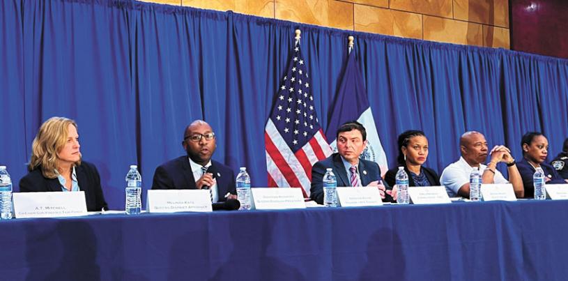 紐約市長亞當斯,紐約市警務處長Keechant Sewell在皇后區東南區羅奇代爾村政府樓舉行里民大會,皇后區長理查茲,皇后區檢察官卡絲等皇后區市政機構代表在會上聆聽不同族裔民眾對社區公共安全的擔憂,會上聚焦有關為社區提供資源以解決槍支暴力、改善社區與紐約警察局的關係、青年參與計劃、心理健康、無家可歸者和經濟適用房的問題。