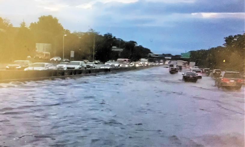 13日清晨一場大暴雨,華、韓裔移民聚居的東北皇后區白石鎮(White Stone) 160 街附近成重災區,新鮮草原、南法拉盛、木邊(Woodside)等低漥地區重演去年9月1日颶風艾達(Hurricane Ida) 造成大面積淹水,街道排水道堵塞,豪雨萬馬奔騰湧進土庫和車庫積水近5、6呎的噩夢。而皇后區與長島交通大重的長島公路(I-495LIE),橫島公路(Cross Island Parkway)等成澤國,汽車在數呎水深道路驚險行駛,引擎淹水拋錨的汽車處可見。
