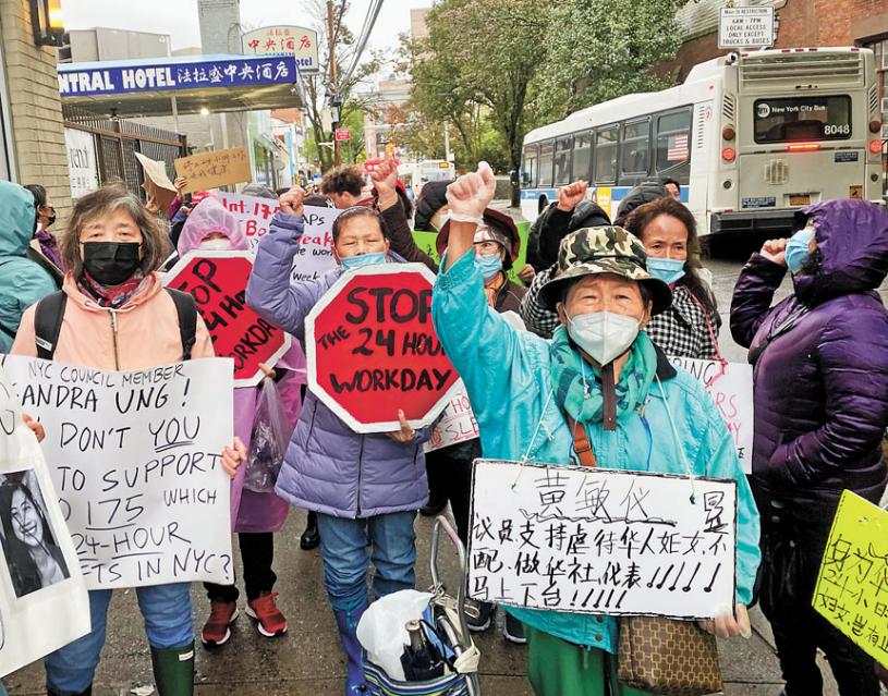當天中午,法拉盛工人中心和華人職工會召集護工抗議,他們高舉「停止種族暴力和24小時工作制」、「結束針對移民婦女的種族暴力,通過175號法案」等標語,高喊「黃敏儀下台」的口號。這是他們第二次抗議,上次在9月22日,他們不滿上次抗議後,黃敏儀通過媒體發表聲明稱她已經與護工進行會面。