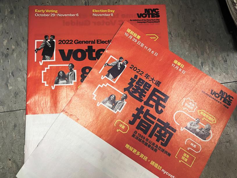 隨著11月8日的中期選舉和10月29日(星期六)開始的提前投票,也為了提高選民投票意識,紐約市競選財務委員發布了今年大選的選民指南,有繁體中文、簡體中文、阿拉伯語、孟加拉語、韓語、旁遮普語、他加祿語、烏爾都語和英語版本。