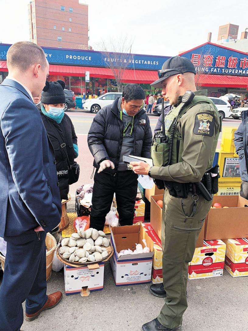 皇后區法拉盛緬街有不少無證攤販在路邊出售來路不明的海產,紐約州環保廳的環保警員(ECO)於29日在當地沒收一批海產,並向無證攤主開罰單。