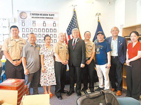 紐約華人聯合會於30日向位於法拉盛的美國海軍及招募辦公室贈送近百盒月餅,州眾議員鄭永佳和多位華裔社區人士到場支持,他們呼籲華人參軍,報效國家。
