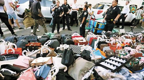 《紐約郵報》報道,市警總巡長切爾(John Chell)在社交媒體上載視頻,顯示警員13日在百老匯街(Broadway)與堅尼路(Canal Street)一帶查處假貨,撿走地上大批假冒名牌手袋,以及陳列於路邊桌子上的冒牌銀包、太陽眼鏡和帽子等。