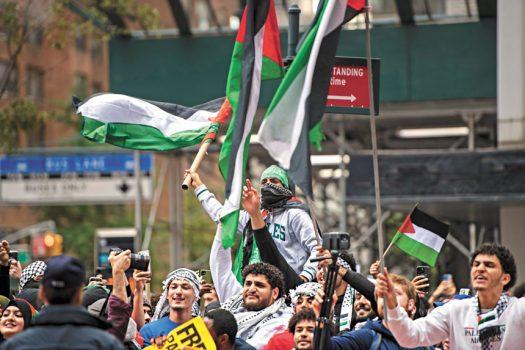 隨著激進組織哈馬斯對以色列發動致命攻擊,以色列對被封鎖的巴勒斯坦加沙進行猛烈空襲,暴力事件激增,導致該地區一千多人死亡、數千人受傷。於8日下午,大約有1000名示威者聚集在時報廣場聲援巴勒斯坦人,而親以色列的遊行者也進行反對抗議活動,雙方在街道兩側設置的警察路障後面對峙,而警察在旁邊監視。幾名抗議者,其中一些披著巴勒斯坦國旗,抓起一面以色列國旗,將其踐踏、撕裂並縱火,導致緊張局勢加劇,一名反抗議者去取回旗幟時,一群人衝過路障,爆發了扭打,其中一名披著巴勒斯坦國旗的男子被警察壓倒在地。