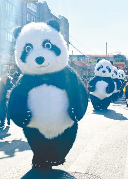 花車大遊行的卡通熊貓引得路人駐足圍觀。