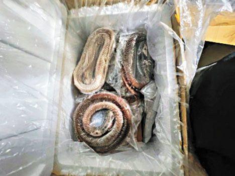調查人員表示,但該集裝箱實際上裝有來自中國的非法家禽商品。甚至在某些情況下,違禁的鵝腸和鴨腸還被藏在包裝好的響尾蛇下面。