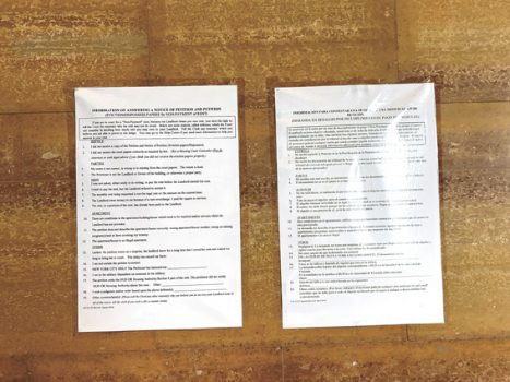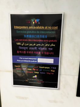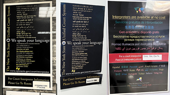 皇后區房屋法庭入口處的「我們講你的語言」海報提供了其他語言版本。然而,儘管皇后區有超過10萬名講中文的居民,建築物內的其他標識大多數隻翻譯成了西班牙語,因此不懂英語和西班牙語的訴訟當事人可能會迷失方向。