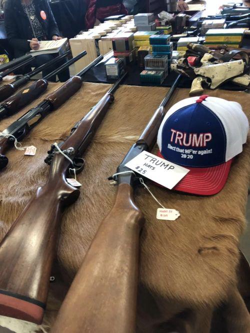 (塔尔萨枪展摊位上摆放着川普竞选连任的棒球帽 摄影:刘立伟)