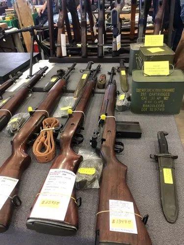 长长通道两旁,展桌一张挨一张,各色枪械令人目不暇给,眼见所及老式枪支居多,油光锃亮,木制枪柄往往已经发黑,枪身镌着制造商名字和序列号,很多产于19世纪晚期。枪贩要么铺块布把它们直接平放在桌上,要么略讲究点用木制枪架凹个造型,有不少还上了刺刀。一枝看似寻常的老式步枪,售价都在千余美元,两三千美元的价签毫不鲜见,有的标价高达6000美元。要想拥枪,没有一点经济实力恐怕不行。