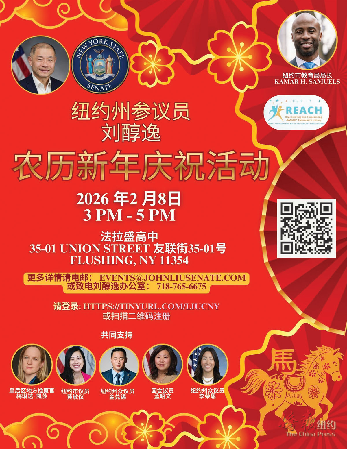 即将到来的农历马年象征着活力、力量和热情,预计当日将有数百人在历史悠久的法拉盛高中礼堂参加晚会活动。会上还将提供当地餐馆提供的免费美食,并有现场音乐、舞蹈和文化表演,演出阵容包括PS203 舞狮队、Korean Fever, Inc.、Kinding Sindaw Melayu Heritage of the Philippines、Ashley Dance Center & Ashley Liang Dance Company, Inc.、Youth Orchestra、CYCNY、Earlssu(韩国传统乐器组合)。