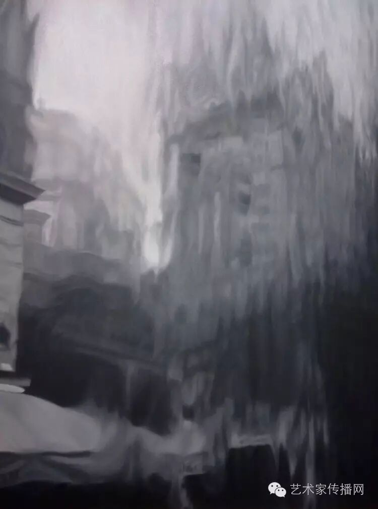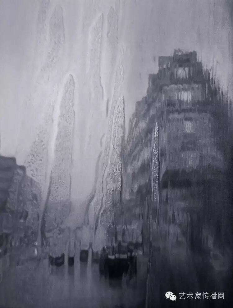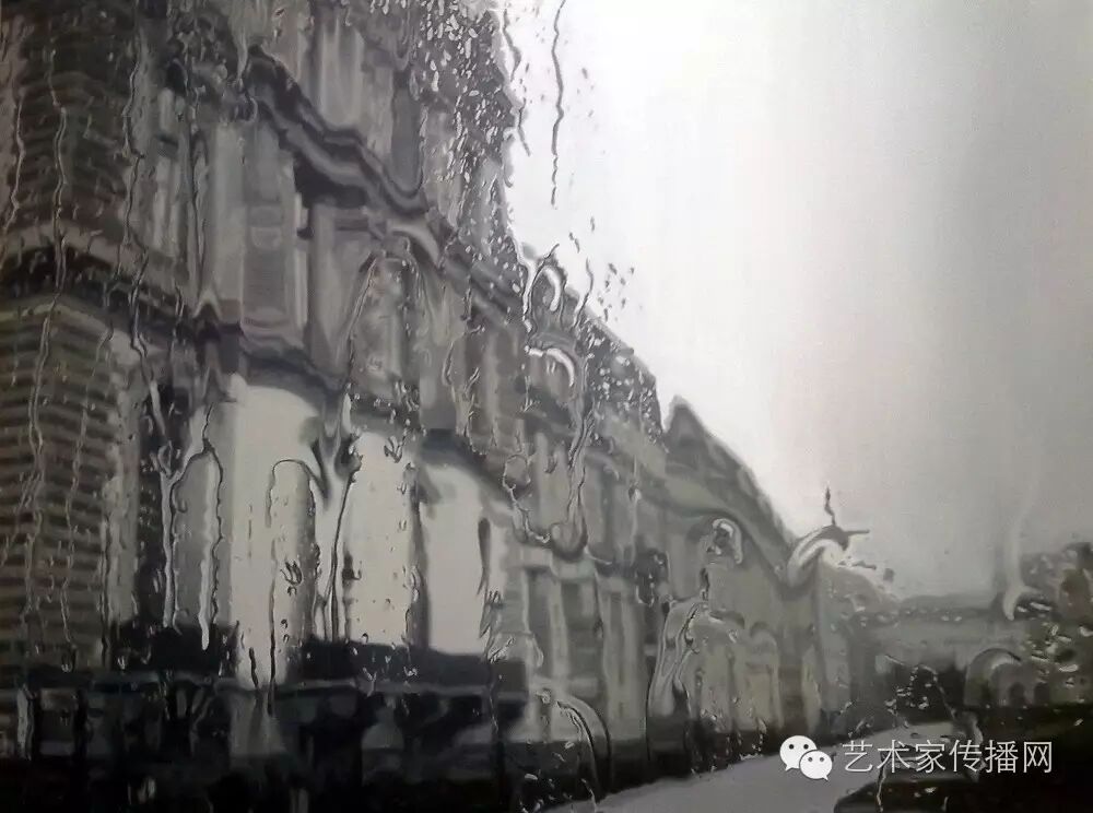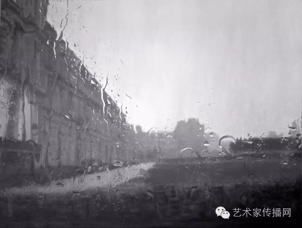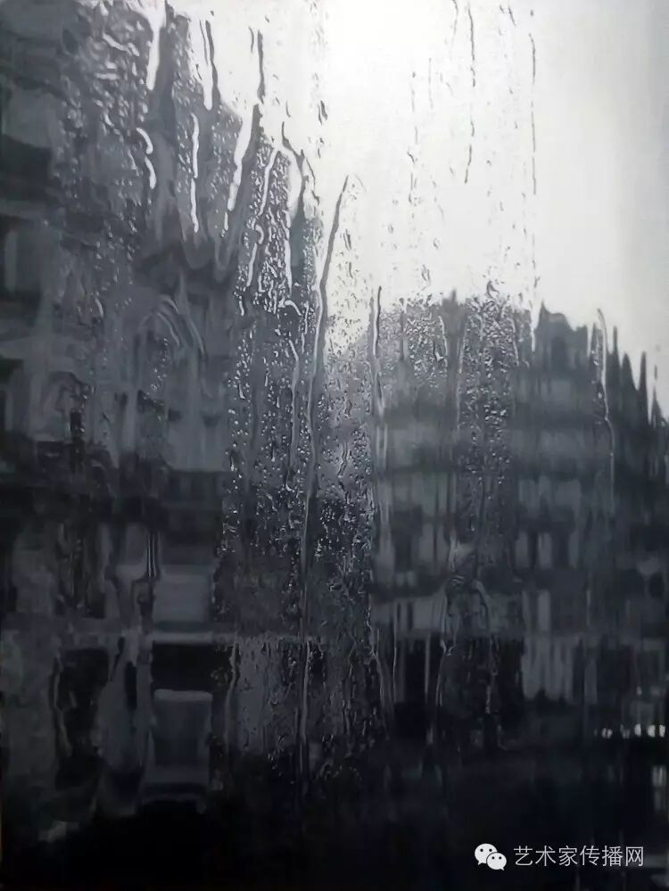 《雨—巴黎印象》系列组画创作于2014年,作品采用写实油画的技法而作,是2012年我随中央美术学院组织赴欧洲进行艺术考察学习时的所见所感。当时在巴黎,对巴黎最直接深刻的印象就是巴黎的天气,我们是六月份去的,天气忽晴忽雨,前一分钟还阳光明媚,后一分钟暴雨说来就来,说走就走,走后又直见彩虹。这一组画虽说记录的是那一刹那的情景,可它不就是生活的真实写照吗,世间事总是变化无常,难以预料的。两年来我一直忘不了此情此景,我是一个南方人,众所周知,南方人对雨都会有一种特殊的感情,来到北京后更是会想念南方的雨,我没想到巴黎的那场雨竟能让我一直念念不忘,也因此我要把它们画出来,在历经两年的酝酿之后,于2014年正式把它们完成了,画出来后,自己也常常会为画面的情景所打动,雨水往往最易撩起人们的情丝和感怀,让人产生深深的记忆和回想----。