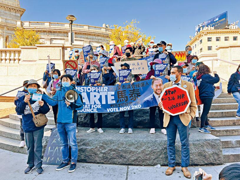 紐約市普選即將拉開帷幕,各位候選人也在緊鑼密鼓地參加各種造勢活動。數十位華埠家庭護理工人20日齊集曼哈頓橋頭附近,宣布支持馬泰(Christopher Marte)競選第一選區市議員,稱他過去一直與護理工人站在一起。在場工人也呼籲盡快結束24小時工作制,分為兩班制以結束不人道的工作制度。