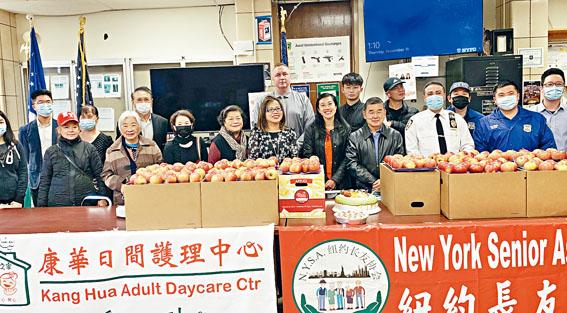 法拉盛康華日間護理中心的高嘉懿、孟廣瑞與非牟利機構紐約友協會會員,以及市議員顧雅明、市議員當選人黃敏儀等11日向紐約市警109分局贈送紅蘋果,感謝警務人員在維持社區治安作出貢獻,新冠肺炎嚴峻,無畏疫情,盡忠職站在最前線崗位服務市民。