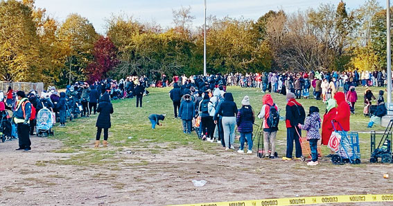 ▲皇后区感恩节免费食品发放现场,民众队伍绵延,大排长龙