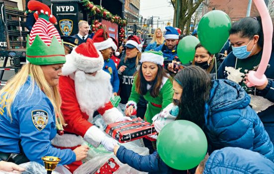 法拉盛商業改進區(Flushing BID), 市警法拉盛109分局與東北皇后區貝賽111分局警民協會合作舉辦的聖誕節及迎接新年聯歡會,11日在皇后北區指揮中心多間分局警車組成車隊,穿上大紅袍的聖誕老人和綠衣裳的天使「聖誕鈴聲」歡樂歌聲中,扺達法拉盛商業區,與來自皇后區的250個華人與不同族裔家庭提前慶祝聖誕節。小朋友把39大道的法拉盛市立第2停車場變成兒童樂園,童稚歡笑聲飄盪,普世歡騰聖節氛圍濃厚。