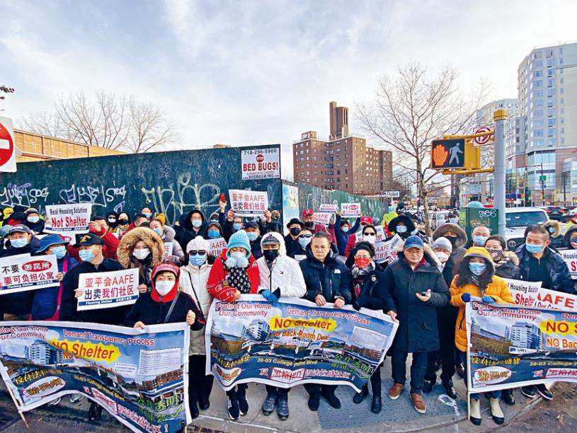 逾百名華人齊聚法拉盛39大道遊民所興建點,抗議亞洲人平等會(AAFE)聯合市遊民局(DHS)暗箱操作,痛斥亞平會出賣社區,要求改建可負擔住房;當日也有遊民所支持者現身,與百人抗議隊伍一街之隔,表示法拉盛需要遊民所和過渡性住房,遭到圍觀民眾的集體抗議。