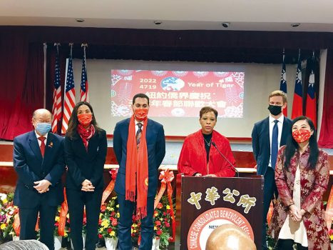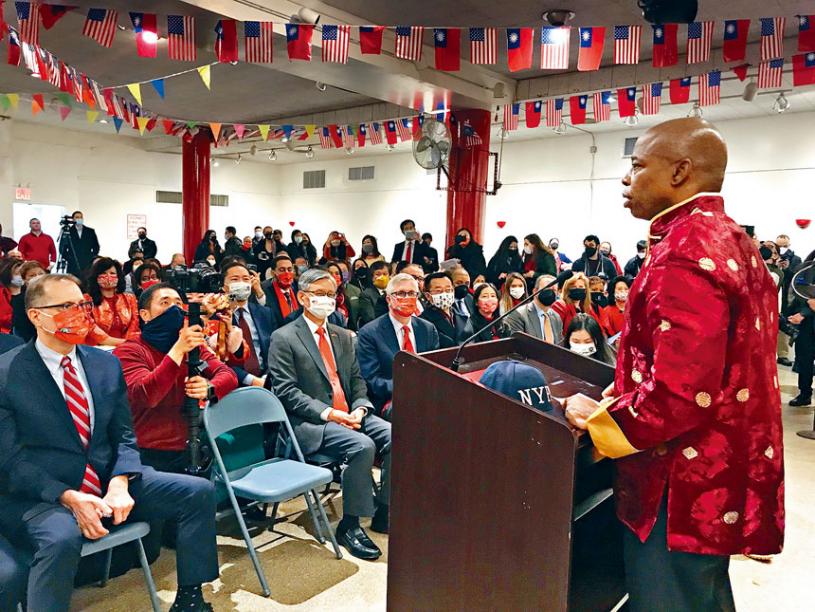 紐約市長亞當斯和州政府運營總監加西亞 (Kathryn Garcia)也親自前來中華公所送上新春祝福給華裔民衆。 亞當斯表示,過去一年,亞裔肩負重擔,不單受疫情打擊,還有仇恨犯案令人痛心,他希望華人社區如老虎堅韌,渡過難關。