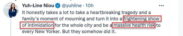 牛毓琳抨擊警察,稱一警員悲慘死亡變成了「可怕的威嚇表演」和「對每個紐約人構成巨大的健康風險」。