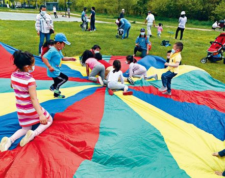 停辦兩年的「法拉盛春季家庭同樂日」活動14日在凱辛娜走廊公園回歸。數以百計不同族裔兒童在公園草地上玩親子遊戲,疫情停擺的戶外活動,消失了近千日的童稚歡笑聲,在公園天空迴盪,像徵隨著疫苗種率和高和新冠肺炎疫情有己有緩和,民眾生活也逐漸回正常。
