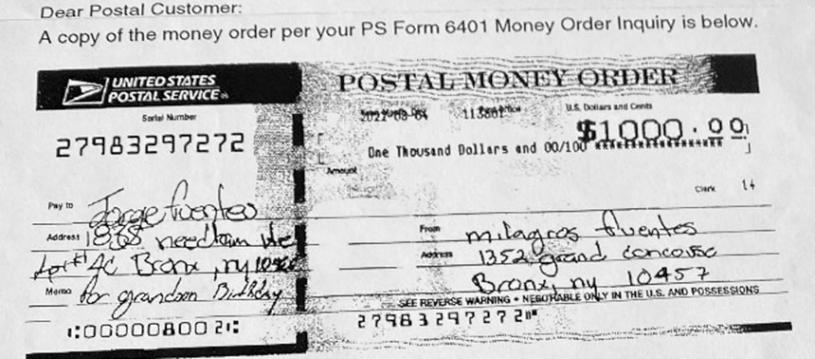 據陳女士介紹,她在數天前接到電力公司因其餐廳仍拖欠電費並面臨被斷電的風險的通知後才知道,電力公司從未收到匯票。她在前往郵局溝通後,郵局的工作人員建議她報警,並寄來了遭篡改的匯票被兌換後的複印件。複印件上顯示,涉嫌非法篡改她逾三萬元匯票的,是一位在布朗士的名為「Jorge」的人。
