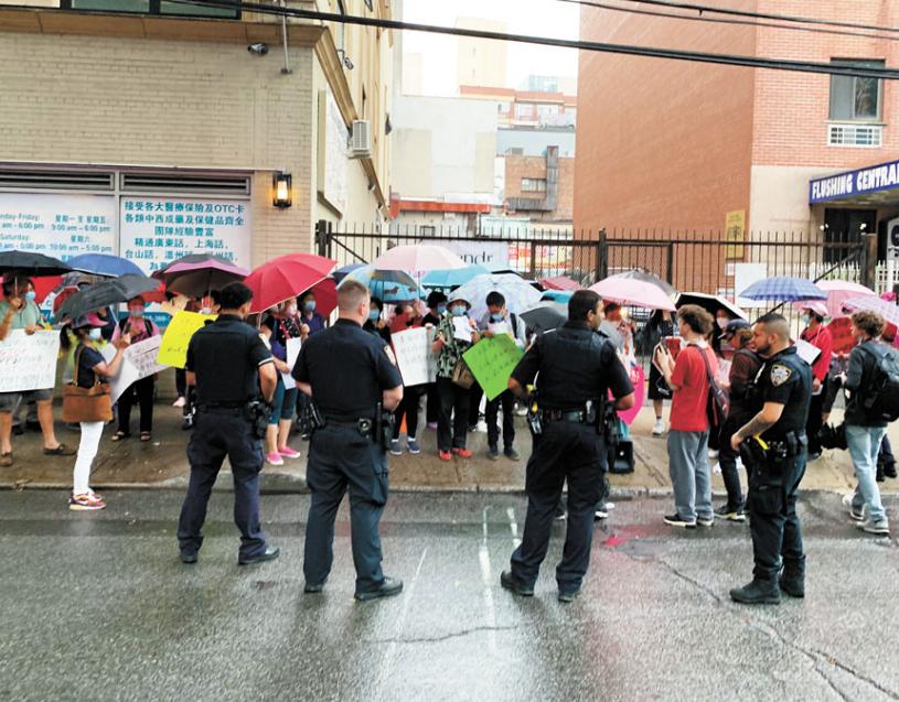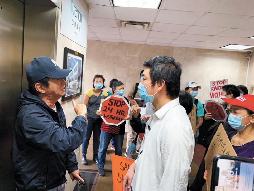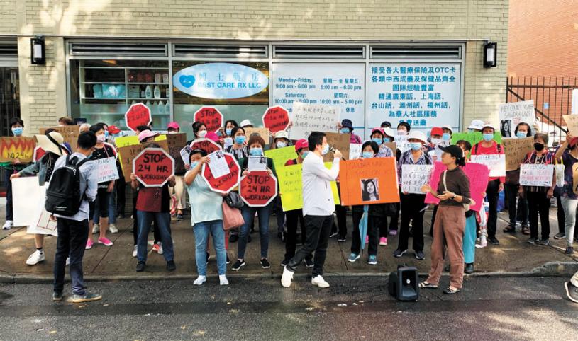 週四中午前,護工們聚集在法拉盛第38街的黃敏儀議員辦公室前,用高音喇叭喊出他們對她不支持Intro 175提案的憤怒。