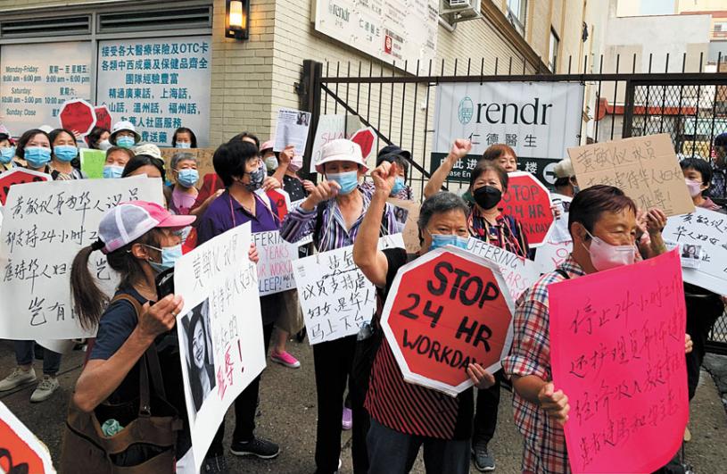 9月22日上午,數十名法拉盛家庭護理工人來到第20選區的市議員黃敏儀(Sandra Ung)辦公室前,要求她支持保護護理工人利益、取消24小時工作日(即分成兩班倒,每班12小時)的Intro 175號提案。