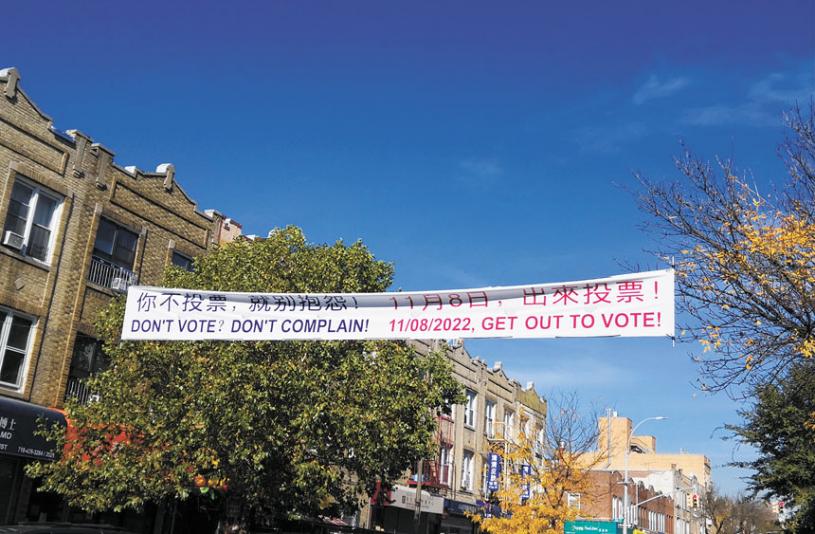 為增強8大道華社華裔民眾的投票意識,促進更多華裔在今年11月8日的普選日及目前正在進行的提前投票中投票,當地華裔民眾於10月30日,將兩條約30尺長的中英文橫幅首次懸掛在布碌崙8大道華社。