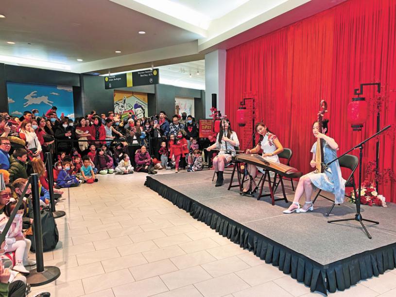 物業集團ShopCore美東區行銷經理孫偉家介紹,天景購物中心至少已經連續6年舉辦慶農曆新年的活動,今年的規模比往年更大,不僅有女子國樂隊用二胡、琵琶和古箏合奏流行樂「青花瓷」和「天空之城」等,還有新苗文藝中心和愛藝舞蹈藝術學校帶來傳統中華舞蹈。