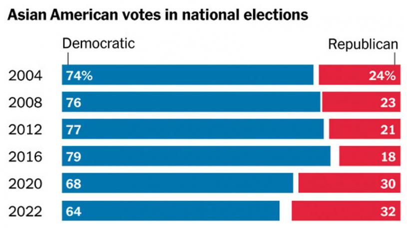 在全國亞裔選民的右傾與美國政治中新的階級分化有關。民主黨尤其是自由派觀點,許多是受過大學教育的專業人士。然而,對於越來越多的工人階級選民來說,該黨已經變得不那麼有吸引力了,許多自由派分析人士聲稱,這主要反映了種族偏見。2018年以來,更多亞裔和拉丁裔選民支持共和黨,這些選民多屬於工薪階層。