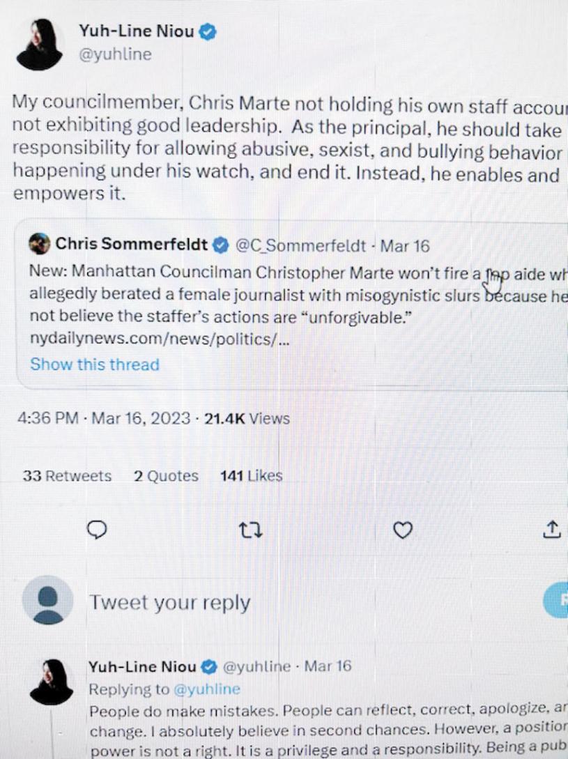 牛毓琳說:「我的議員馬泰沒有讓自己的員工承擔責任,沒有表現出良好的領導能力。 作為議員應該承擔責任,卻允許在他的監督下發生辱罵、性別歧視和欺凌行為,他沒有予以製止。 相反授權它。」