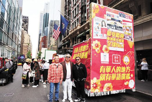 星島日報全美行政總裁梅建國(中)與華語電台台長林悠樂在遊行花車前合拍。