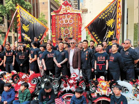 本報行政總裁梅建國與蔡李佛醒獅團Wilson Ng師傅及一衆師兄弟合影。