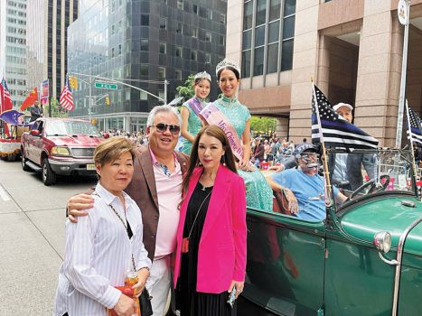 紐約市移民部局長Castro(左二),市長亞當斯亞裔高級顧問鄭祺蓉(左三)在星𡷊及華語電台花車上向群衆揮手致意。