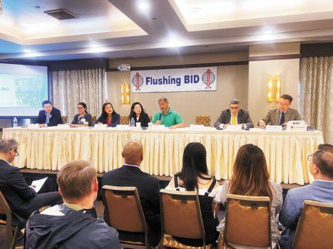 州參議員劉醇逸、市議員黃敏儀、市交通局長羅傑貴斯(Ydanis Rodriguez)、市長辦公室社區服務局副局長陸里安諾(Anthony Luliano)等市府代表和商改區董事就法拉盛的近況展開討論