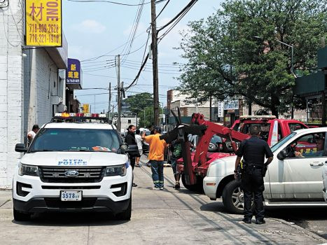 一輛汽車17日上午在法拉盛一停車場魯莽駕駛,衝出停車場外牆,造成坍塌,並撞進對面鄰居家中。