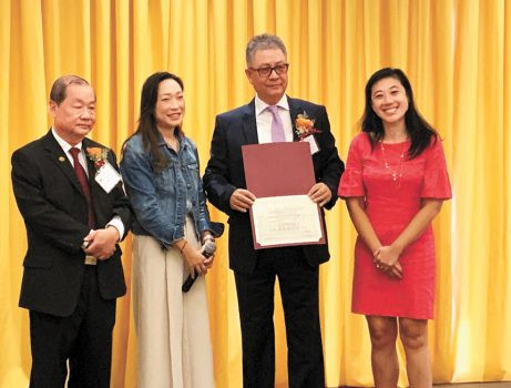 黃敏儀(右一),奧克蘭花園區市議具李琳達(左二)頒感謝狀給王耀明(右二),左一是杜彼得