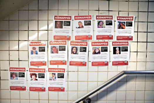 自以色列和哈馬斯戰爭爆發以來,紐約街景都被以色列民族的痛苦象徵所覆蓋:一張張傳單貼在路燈、樹幹、停車路牌及地鐵站樓梯間,每張傳單上都用大寫字母寫著「綁架」一詞,並印上在以色列被哈馬斯恐怖分子所綁架人質的照片。