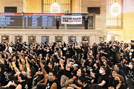 27日晚上高峰時段,數百名親巴勒斯坦抗議者在中央車站的大廳內舉行大規模靜坐,迫使車站暫時關閉,導致多達200人被捕。身穿黑襯衫、寫著「猶太人說現在停火」的示威者,佔領了車站廣闊的大廳,高喊著「不再使用武器,不再有戰爭,停火是我們為之奮鬥的目標。」
