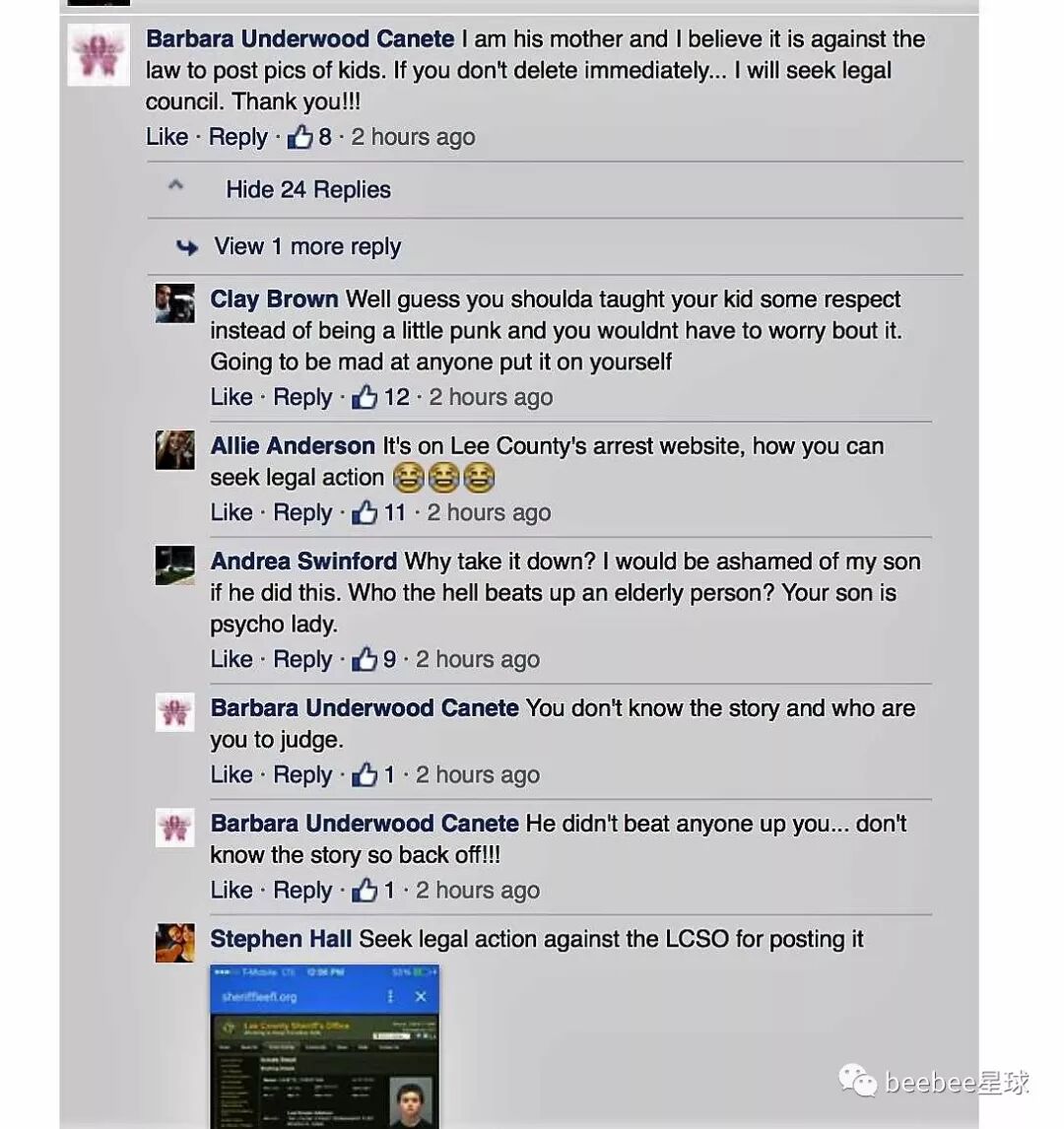 母亲芭芭拉·安德伍德·卡内特显然对她儿子的照片传遍了脸书而感到不满,发表了如下评论:我是他的妈妈,我相信公布孩子的照片是违法的。如果你们不立即删除,我将寻求法律顾问。谢谢!