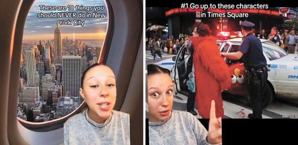 她2月初在TikTok 分享在紐約市最不該做的10件事說,「我犯過所有這些錯誤,因此你不必這樣做。」她列出的排行榜中,排首位的是切勿接近時報廣場上任何穿著卡通人物服飾的人,因為這些人利用卡通人偶吸引民眾拍照,趁機盜竊甚至綁架,在當地臭名昭著。